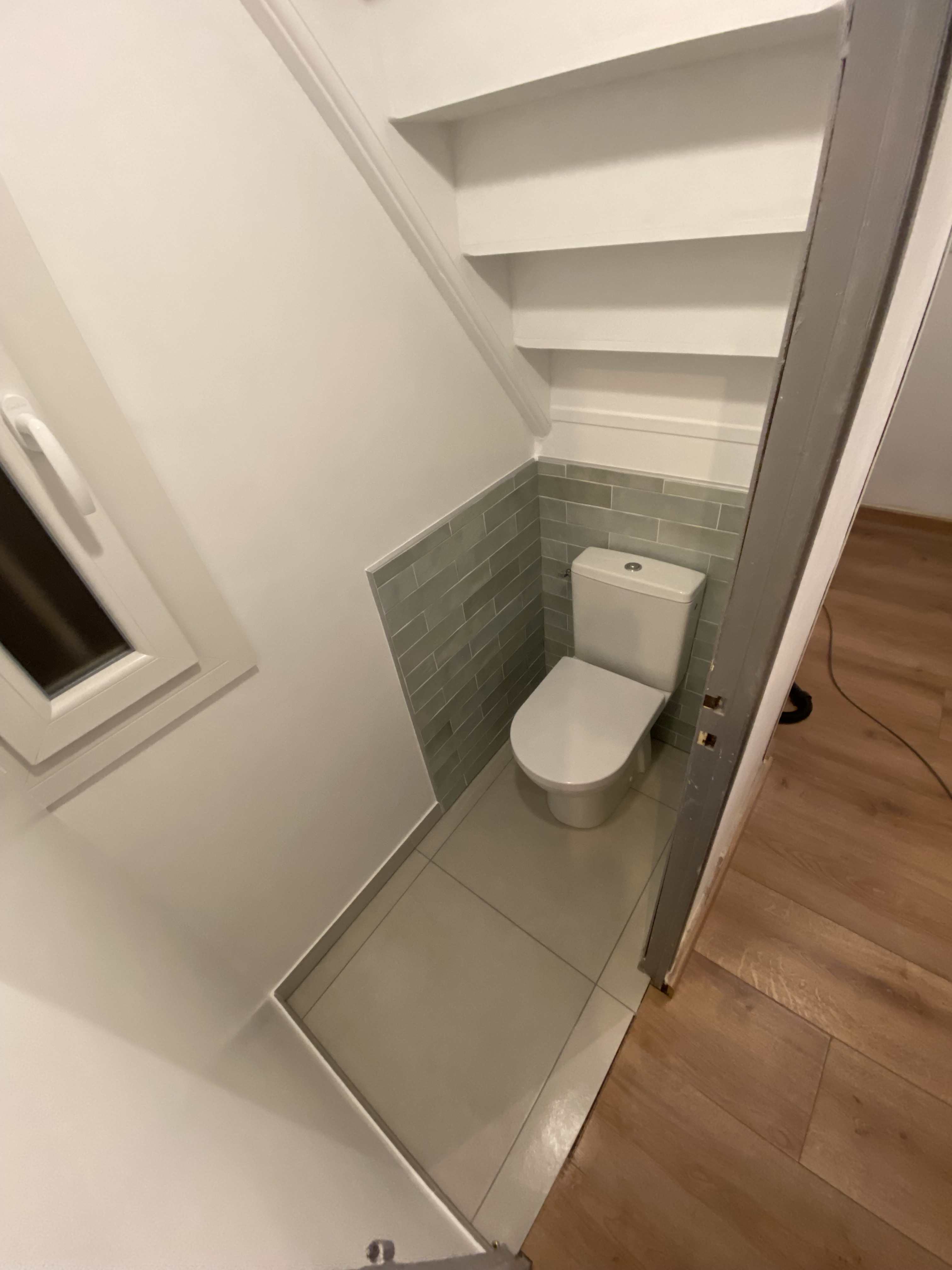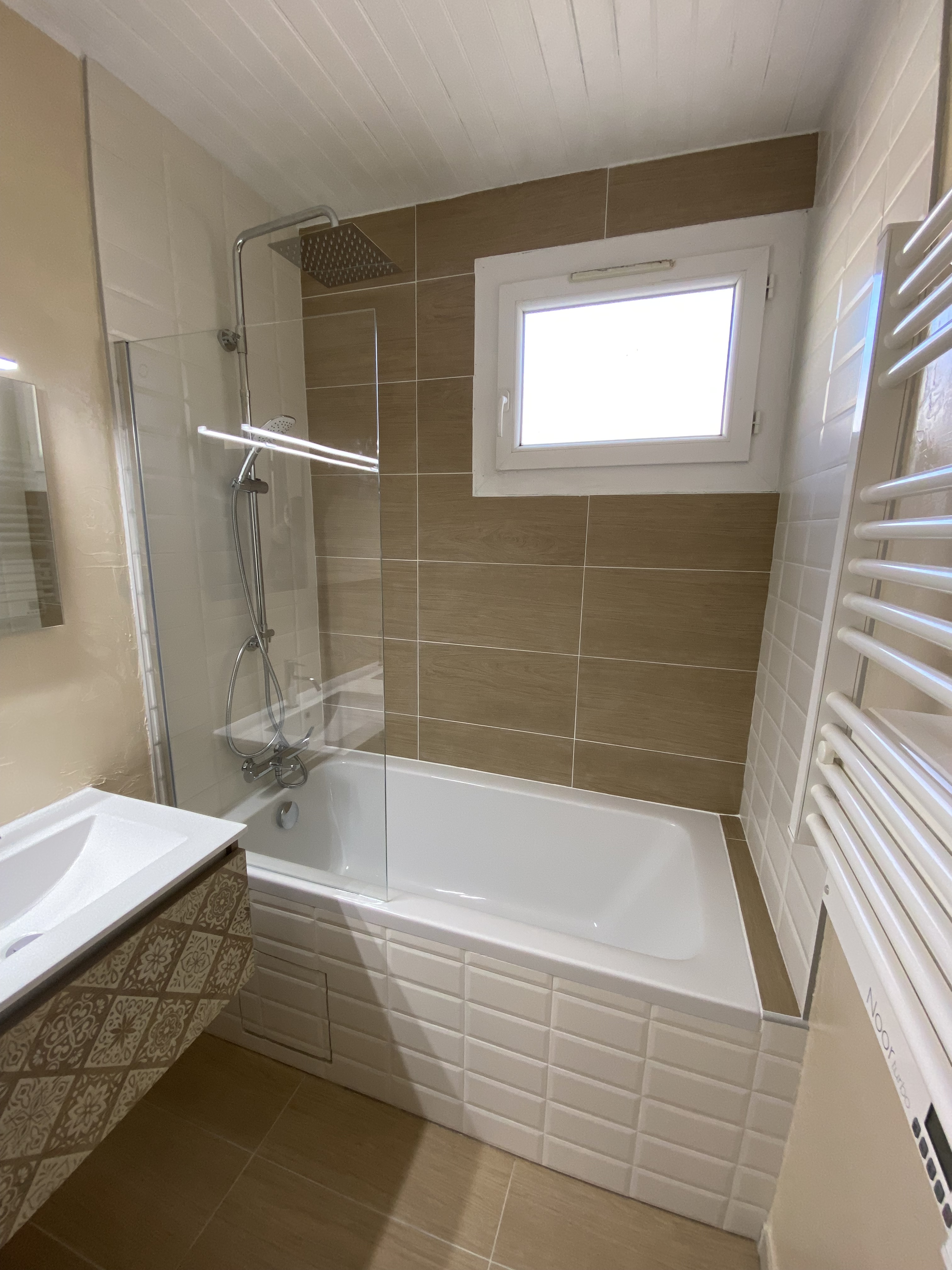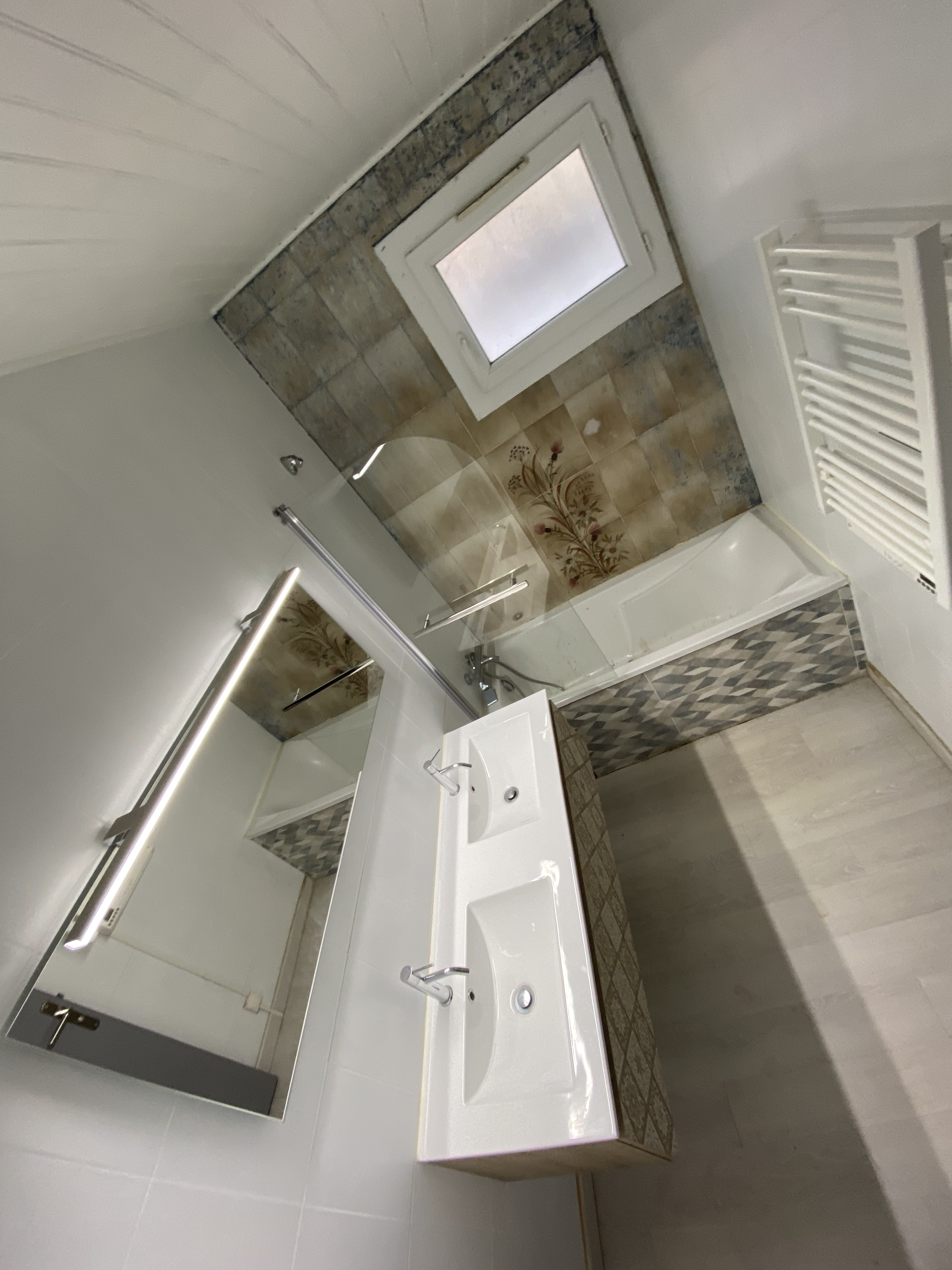 Rénovation Salle De Bain : carreaux de métro et imitation bois